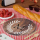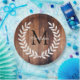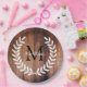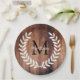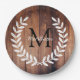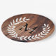 Deep, rustic, and country dark wooden barn wood looking planks background with white laurels silhouette framing your choice of monogram letter in black and full family name in white script. These plates are great for weddings! Check out the matching paper napkins!