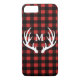 Rustic buffalo check plaid in red and black phone case. It features a country white deer antlers silhouette with monogram letter.
