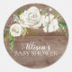 Pretty baby shower favour seal featuring a watercolor white floral bouquet set on a rustic wood background