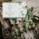 Light sage and wood. White Floral. Elegant. Wedding Invitation. Wood Background. No Parents listed.