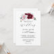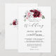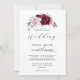 This elegant wedding invitation features a classic, yet rustic aesthetic, centered around a beautiful header arrangement of deep maroon, blush pink, and soft white roses accented with muted grey-green foliage. The design uses a combination of sophisticated script for the "Wedding" title and clean, classic serif fonts for the essential details, creating a beautiful balance. Printed on a textured white background, it conveys a romantic and timeless feel, perfect for a fall or vineyard wedding celebration.