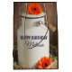 Birthday gift bag with a rustic theme. A white milk jug and a couple of orange flowers placed around the milk can. Sitting in a barn on some hay. Wooden panels in the background.