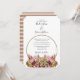 This design features a rustic wild flower bouquet. A simple gold circle frame encircles the text while the bride's and groom's names are positioned on top. The rustic pink floral colour tones compliment the greenery of the leaves. The gold tones tie everything together to create a rustic country woodland garden feel. Golden and pink stripes cover the back of the design. Elegant wedding invitation design with modern elements. Matching wedding stationery items and other wedding invite formats are also available.