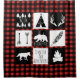 Rustic adventure themed shower curtain with red and black plaid. It has cute black and white antlers, tee pee, trees, wolf, bear, arrows, and cute text.
