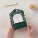 ALSO AVAILABLE WITH A QR CODE, WITH TWO DINNER OPTIONS OR WITHOUT DINNER OPTIONS. This design features a soft wildflower frame around a cream oval on an emerald green background. Personalised All-In-One invitations are a unique combination of both a beautifully printed custom invitation with an easy to tear off perforated RSVP postcard. And they are so easy to use! You simply fold, then seal the back flap with the three included clear stickers, and mail. And when your guests receive your custom invite, they just tear the perforated RSVP Card off and drop it back in the mail to you!