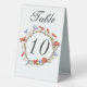 Wedding table number featuring a rustic watercolor wildflower wreath. Flowers such as poppies, cornflowers, bare twigs and grass.