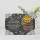 Stylish country wedding invitations featuring a rustic black chalkboard backdrop, bridal lace corner decoration, string twinkle lights, summer golden yellow sunflowers, a winery wooden barrel wiith your initials and a piece of knotted string.