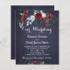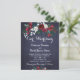 Floral bouquet of red burgundy and white peony roses with pine and hunter green fir branches and foliage affordable wedding invitation template with a fancy modern contemporary changeable script text over a dark midnight navy blue chalkboard background. +++++++++++++ The invitation is ideal for winter floral rustic Christmas seasonal weddings. ++++++++++ PLEASE READ THIS BEFORE PURCHASING! This is a budget affordable wedding card printed on a paper sheet (each sheet has one card). ++++ For the best rapport price-quality, our advice is to choose the Semi-Gloss paper type (it is thick enough to be used for stationery) ++++ If you need envelopes, choose the ENVELOPE OPTION. +++ Double-check all the information and spelling of your text because you will receive exactly what you see - no one else will check anything before printing. ++++ This card is designed for size 4.5" x 5.6". In the case you choose another size of the card and text goes outside page, everything needs to be fixed before adding the product to cart. Please ask Live Design Service for help.