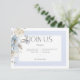 Introducing our exquisite winter floral wedding reception card, a celebration of love amidst the enchanting beauty of the season. With its icy blue and white double frame, this invitation exudes elegance and sophistication. Soft blue and white watercolor winter floral bouquets, adorned with delicate touches of yellow, tan, and green, grace the opposite corners of the pristine white text box. Bound together with flowing ribbons, they symbolise the unbreakable bond between two souls. As you turn the invitation, the back reveals a complementary icy blue backdrop, slightly distressed with white, presenting a harmonious watercolor floral bouquet that complements the front with effortless grace. Prepare to captivate your guests with this enchanting invitation, a reflection of love's blooming journey amidst the winter's embrace. The poetic blend of colours and artistry sets the stage for a wedding celebration that will be cherished as a timeless masterpiece. Embrace the magic of the season and invite your loved ones to join you on this wondrous journey of love and happiness. This design is part of the Rustic Winter Frosty Blue & White Floral wedding suite created by Simply Farmhouse Press.
