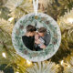 Elegant "Merry Christmas" round metal holiday photo ornament design features a rustic chic white wood grain background with a wreath of winter watercolor greenery framing the family picture. Personalise the modern and stylish green and charcoal grey wording with your choice of greeting, last name, and the year.