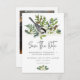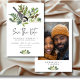 Celebrate your love with the serene beauty of winter. Our nature-inspired wedding save the date card features a delicate watercolor bouquet of rustic pine, pinecones, mistletoe with white berries, dusty blue thistles, and a soft touch of ferns—capturing the quiet magic of the season. A graceful grey and white bird perches gently above your wedding details, adding a romantic, woodland charm. Finished with a clean, modern font, this design brings elegance and warmth to your special day. Your favourite couple photo adorns the back. Perfect for a winter wedding filled with natural wonder. Created by Simply Farmhouse Press.