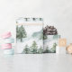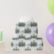 This rustic holiday wrapping paper features a watercolor pattern of an evergreen forest of pine trees at the base of a mountain.