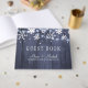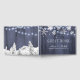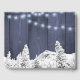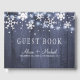 Rustic country style personalised guest book with white snowflakes, a mountains landscape (on the back) and twinkle hanging lights on dark blue grey barn wood background. Ideal for your winter | elegant rustic country | wonderland themed wedding.