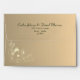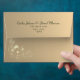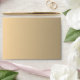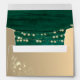 Elegant, modern gold 5x7 envelope for wedding invitations with return address at the top flap, floral lace, and rustic green wood with string lights inside.