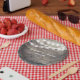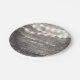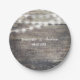 Rustic wood and string lights wedding reception plates.a vintage grey wood background decorated with string of lights. Perfect wedding invite for wedding with night lights wedding theme, barn theme, garden theme, outdoor wedding with twinkle lights.