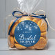 Rustic Bridal Shower round sticker featuring lights in mason jars and strings of lights with the word "Bridal Shower" against a blue wood pattern background. It's the perfect sticker for a rustic or country bridal shower. Check out matching invitation and items like stickers and stamps here https://www.zazzle.com/collections/rustic_wood_mason_jars_and_lights-119202204970019494?rf=238364477188679314