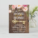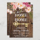 Our House Warming Invitation is a unique and timeless design featuring stylish script type reads "Home Sweet Home" with blush pink boho floral, string lights and rustic wood background.