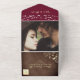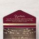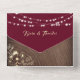 This rustic all-in-one wedding invitation features a cosy woodgrain background, burgundy tones, glowing string lights, and delicate floral accents—perfect for barn, woodland, or country-themed weddings. With built-in RSVP, a spot for your wedding website, and a personalised photo and return address on the back, this eco-friendly design offers both style and practicality. Please note: A separate envelope is required for mailing.
