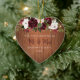 This heart shaped photo keepsake Christmas ornament features a rustic wood background, with burgundy and blush watercolor floral bouquet at the top, commemorating the newlyweds’ first Christmas as Mr. & Mrs. There is an easy to use photo template on the back. Find matching wedding stationery, décor, and many more products in the collection, or contact me through Zazzle Chat for more products or design tweaks.
