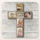 Modern First Holy Communion illustration featuring a wooden cross with pinned communion related images on a rustic background. Easily to change the 2 sample photos of the communicant with your own pictures to personalise the product.