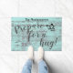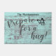 Welcome your guests with this fun script typography rustic door mat design personalised with a name and "Prepare for a hug". Fill in the text field with a family name, remove the name or click customise to select a font style, size, and colour you prefer.