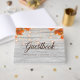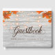 Rustic Grey Wood "Fall In Love" String Lights, Gold Sparkles & Fall Leaves Seasonal Wedding Guestbook.