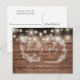 A rustic RSVP card featuring pretty string lights, hand drawn floral garland and chic typography on a wood panels background. The reverse features your details and a fun guest song request. Designed by Thisisnotme©