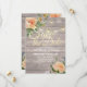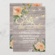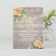 Save The Date Wedding Invitation Card Templates - Faux Gold Foil Script with Peach White Roses Floral and String Lights on Rustic Wood Background.