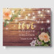 Wedding Guestbook Templates - Elegant Gold Script with Peach White Roses Floral and String Lights on Rustic Wood Background.
