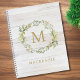 Rustic Wood Floral Watercolor Monogram Notebook. A dainty, boho watercolor wreath with your custom monogram and name in an elegant gold serif typography. This design features a warm, light wood rustic background.