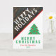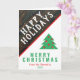 Rustic Wood Fun Green Red Family Christmas Holiday Card. The design has festive red, green and white colours and a simple Christmas tree. The background is in rustic dark wood. Personalise with your text. You can also change or erase all the text on the card.