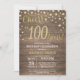 100th Birthday Invitation with Rustic Wood and Gold Glitter Diamond Background. Country Vintage Retro. Gold Confetti. Adult Birthday. Male Men or Women Birthday. For further customisation, please click the "Customise it" button and use our design tool to modify this template.