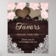 Personalized rustic floral wedding favors sign featuring blush pink roses, baby's breath flowers and two burlap hearts against a rustic wood background adorned with white floral lace and string lights. Matching items available to complement this favor sign.