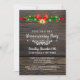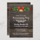 Rustic wood holiday housewarming invitations- Old wood photo background. At the top is a classic Christmas pine bough garland decorated with gold Christmas bells, snowflakes, red berries, bow and ribbon with scattered snow. Reads 'Please Join Us for a Housewarming Party' in handwritten look with shadow. An elegant scroll border separates the introduction from the party details. Back has matching rustic wood background. Note: All images are printed. Use the Customise It button to change anything - font styles, sizes, colours, or placement. Classic Christmas theme winter housewarming invites for rustic themes, country housewarming parties, cabin housewarming and housewarming party during the holiday Christmas season. Elegant open house party or tree trimming party invitation as well. We have coordinating holiday party supplies in our Zazzle.com/angela65 shop.