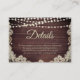 Rustic wedding details enclosure cards with beautiful brown country wood with glowing string lights and accented with ivory, cream, off-white lace for a modern country or vintage wedding. Contact the designer via Zazzle Chat or makeitaboutyoustore@gmail.com if you'd like this design modified or on another product to complete your wedding suite or coordinate ceremony and reception decorations and supplies.