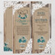 Rustic wood with white lace and baby's breath blue floral bouquet in mason jar with burlap, lace, and twine trims over linen-look text background and heart etching with monogram country style wedding program.