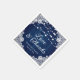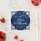 These elegant and romantic rustic navy blue wedding paper napkins featuring a barn wood and white floral lace background adorned with string lights are ideal for a navy blue rustic country/barn wedding party. Easily personalise with your own wedding details.