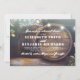 Rustic country rehearsal dinner invitation features winery oak barrels, the romantic string of lights, baby's breath flowers, and the old barn wood background.