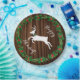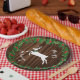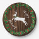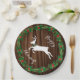 Festive Christmas paper plate done in a rustic dark stained wood look, with graphics of pretty green and red holly, around the edges. A white silhouette of a deer, with a holly wreath around it's neck, decorates the centre of the plate, with custom white text. Personalise the text to read what you want. Great plates for your holiday party.
