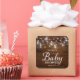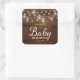 Rustic Baby Shower square sticker featuring lights in mason jars and strings of lights with the word "Baby Shower" against a brown wood pattern background. It's the perfect sticker for a rustic or country baby shower. Check out matching invitation and items like stickers and stamps here https://www.zazzle.com/collections/rustic_wood_mason_jars_and_lights-119202204970019494?rf=238364477188679314