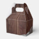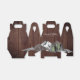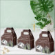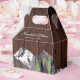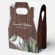 Elegant rustic wedding favour box featuring beautiful snow capped mountains and pine trees with modern typography against a barn wood background.