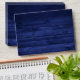 Personalised navy blue rustic wood wedding envelopes with a return address on a rustic wood background.
