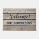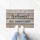 A warm and cosy personalised family doormat. "Welcome!" and the family name printed against a photo of warm wood slats. Perfect for your farmhouse, beach house, boathouse or any house!