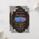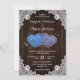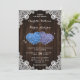 Rustic purple and blue floral wedding invitation featuring two floral hearts on a barn wood background adorned with white floral lace.