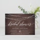 Our rustic elegant bridal shower invitations feature a faux wood plank background with strings of white lights across the top, and "bridal shower" in chic calligraphy script typography. Personalise with your bridal shower and registry details beneath in white lettering.