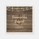 Personalised wedding reception napkins with a rustic, country, brown, weathered barn wood background and soft yellow string lights with first names and your wedding date. your wedding date in a country western hand-printed font and your name in a brush script font.