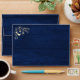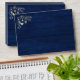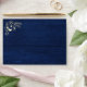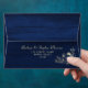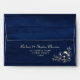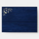Elegant, modern, rustic barn wood navy blue 5x7 envelope for wedding invitations with return address, string lights and gold gilded floral lace.