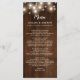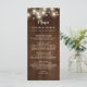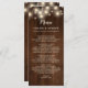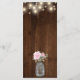 Rustic wood string light wedding menu features pink peonies in a mason jar.