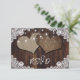 Elegant rustic country wedding RSVP cards inspired by rustic wood, burlap and lace. Easily personalise these romantic rustic country wedding response cards featuring burlap hearts on a rustic wood background adorned with string lights and white floral lace.