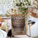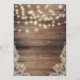 A classic wedding theme with a rustic wood background, faux vintage lace, and string lights. This menu features a starter, main, and dessert.